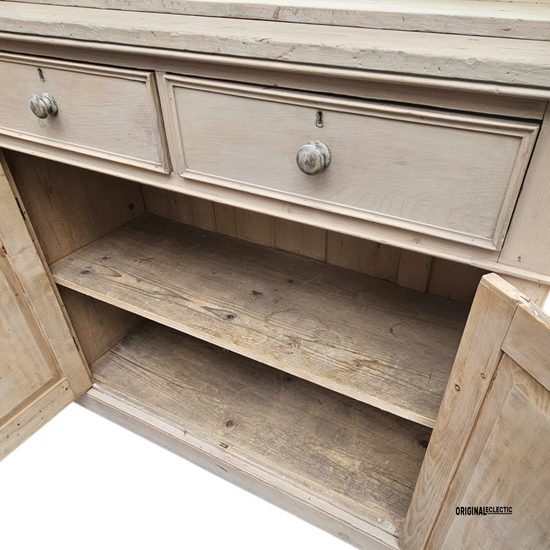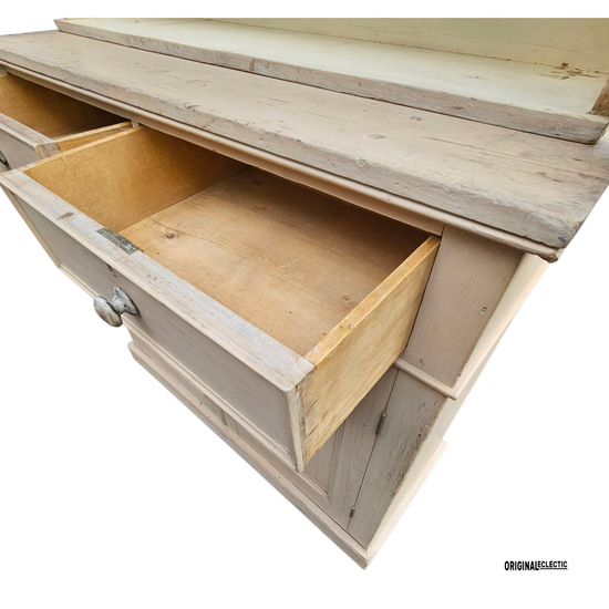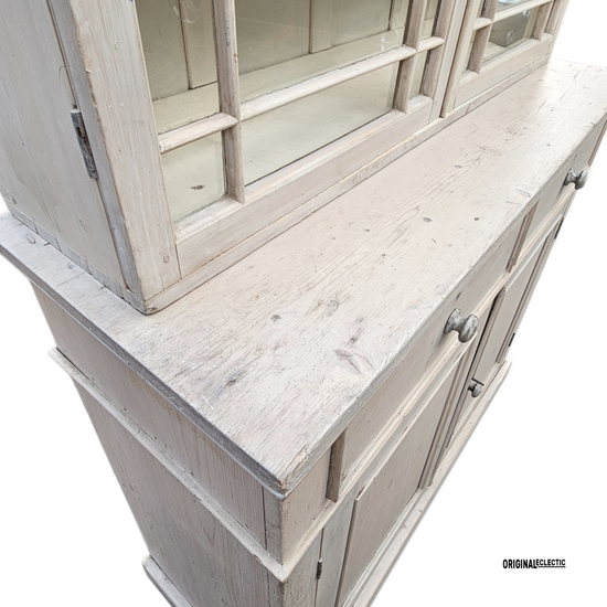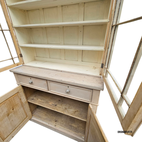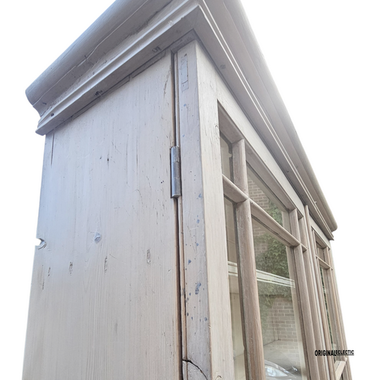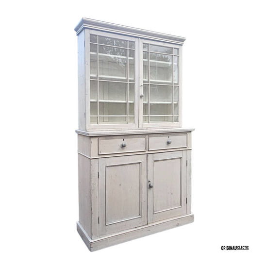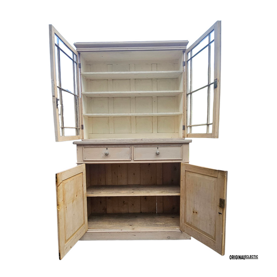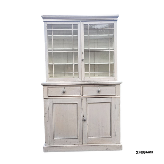 Lots of storage and display, inside has original distressed of white paintwork with marks, base has ample storage. Constructed of solid pine, working locks and keys and new catches fitted, in two pieces