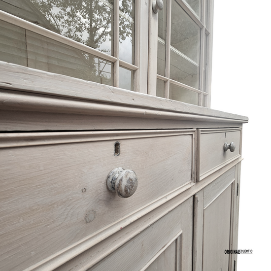 Quality RUSTIC Early Victorian antique glazed display dresser cupboard, Swedish Gustivan style, wonderful beaded detail to the glazed doors finished in a distressed white wash finish