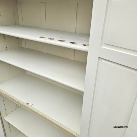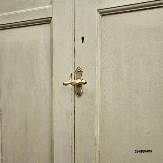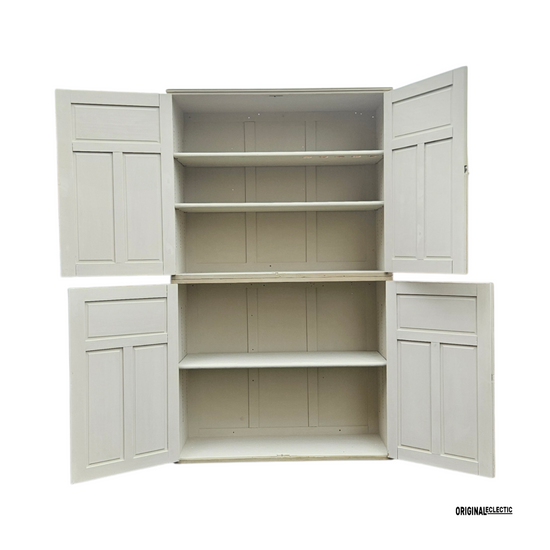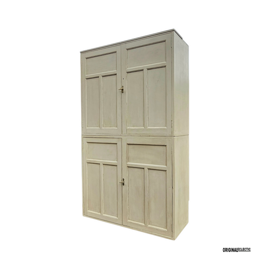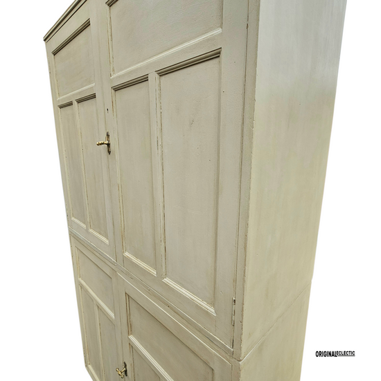 Quality four door cupboard which dismantles into two pieces with outstanding original brass trun handles, the i aide and shelves has been painted in an old white distressed finish, ample storage, constructed of solid pine, new catches fitted