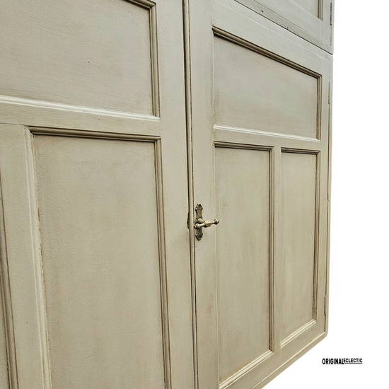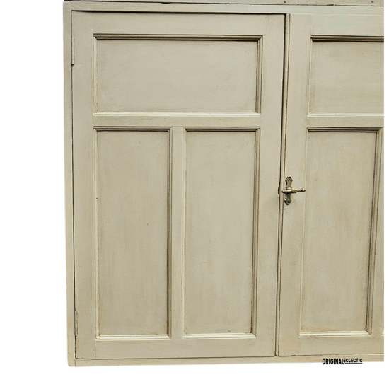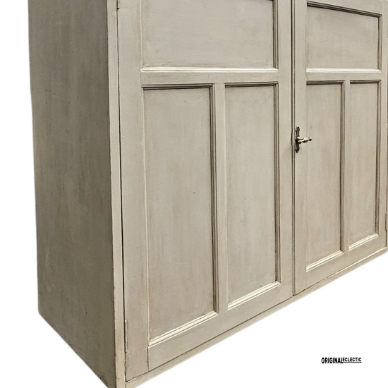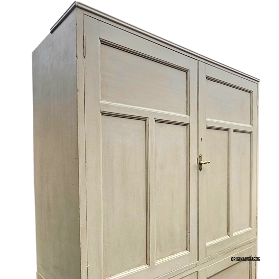 Outstanding RUSTIC large antique pine estate housekeepers cupboard originally firm Warwick castle, painted in a Farrow & Ball light grey and given an aged wax finish