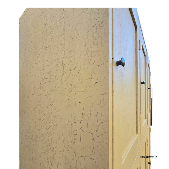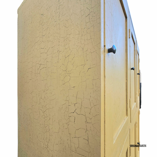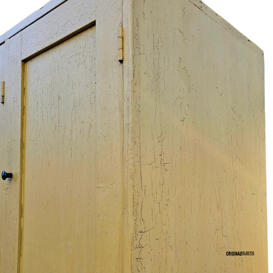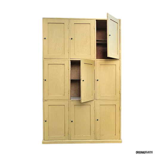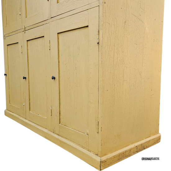 Outstanding RUSTIC large antique school Lockers housekeeper cupboard, outstanding original crackle glazed finish painted in a Farrow & Ball India yellow paintwork with some distressing, finished with an aged wax finish, some old paint showing