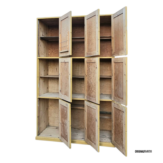 Quality large school bank of lockers cupboard with original bakelite knobs, constructed of all solid pine which has ample storage, has mixture of original old shelving inside. New catches fitted. Inside has been cleaned